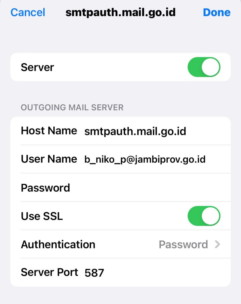 - Host Name: Masukkan alamat server outgoing mail (biasanya sama dengan incoming, contoh: smtpauth.mail.go.id)
